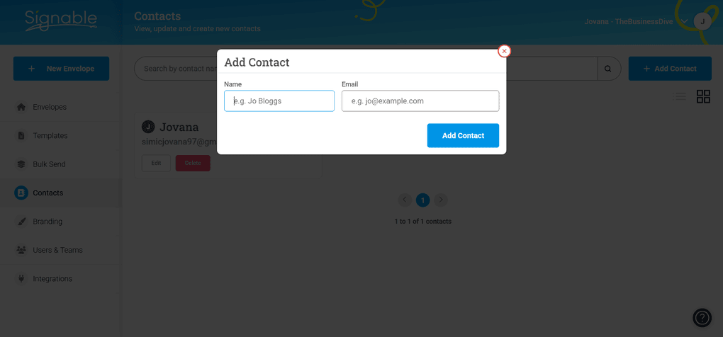 Adding a new contact in Signable couldn’t be simpler, as you only need a name and email address. This feature might seem basic, but it saves time when setting up new envelopes, since you don’t have to re-enter details for frequent recipients.